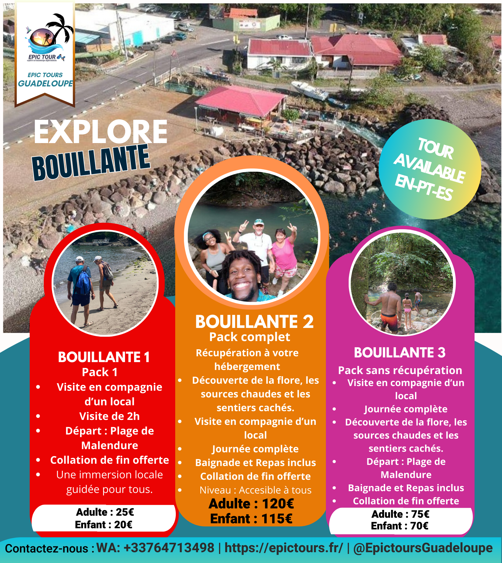 La formule idéale pour profiter de Bouillante sans contrainte ! Découvrez chaque recoin de la ville, relaxez-vous dans les eaux chaudes et dégustez un délicieux repas local.